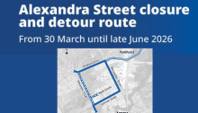 A section of Alexandra Street, between Wade Street and Birkbeck Drive, will be temporarily closed from 30 March for approximately 12 weeks (until late June) as part of the Rockhampton Ring Road North project.